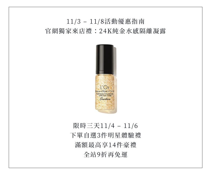 好用就是要大家都不能錯過,雙11正式開打,全新#金光瓶買任一就送小金瓶,進入冬季肌膚乾荒季節,在粉底中加入一滴小金瓶馬上貼妝24 小時沒問題。