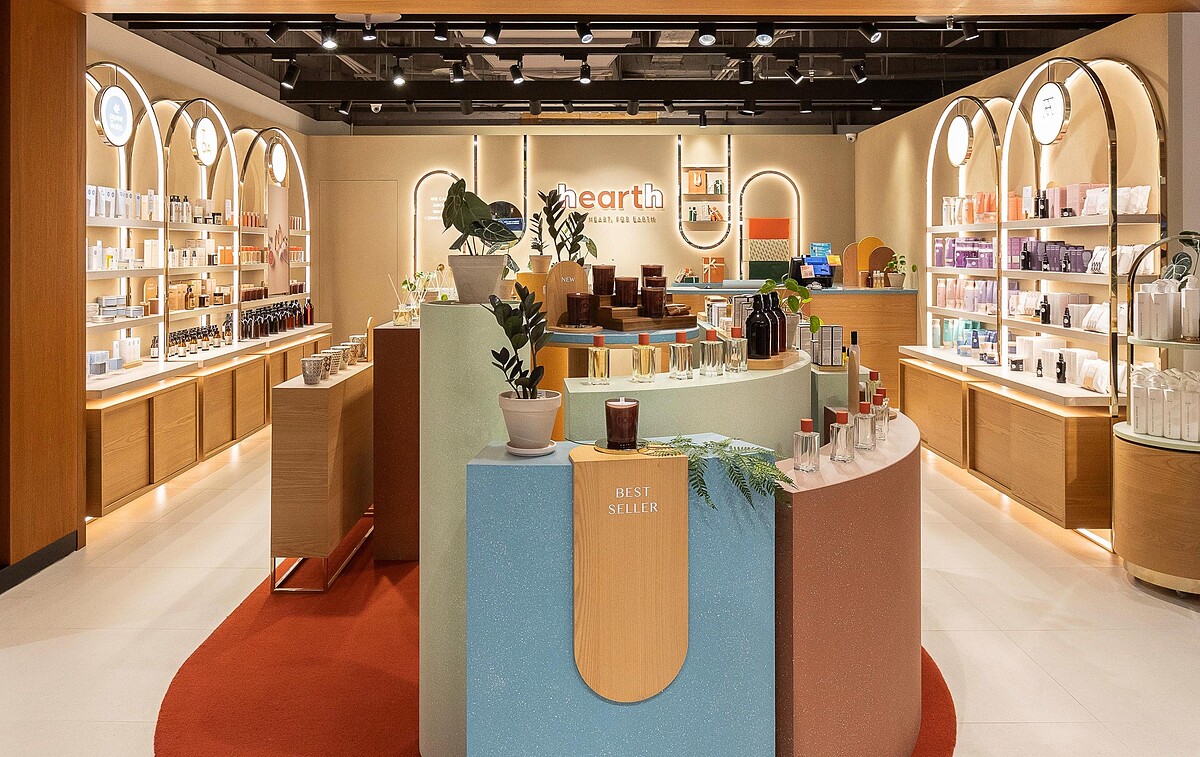 一踏入店內隨即能感受貫穿全店的「大地橘」象徵了活力與溫暖,是hearth對於美的追求永不止息。點綴其中的還有海洋藍、草原綠、暖陽黃,均來自大自然啟發,讓大家走進hearth就能感受繽紛多彩的地球縮影。中央規劃成「 beating heart 」如同樂高般的移動櫃體,組成最有趣陳列。