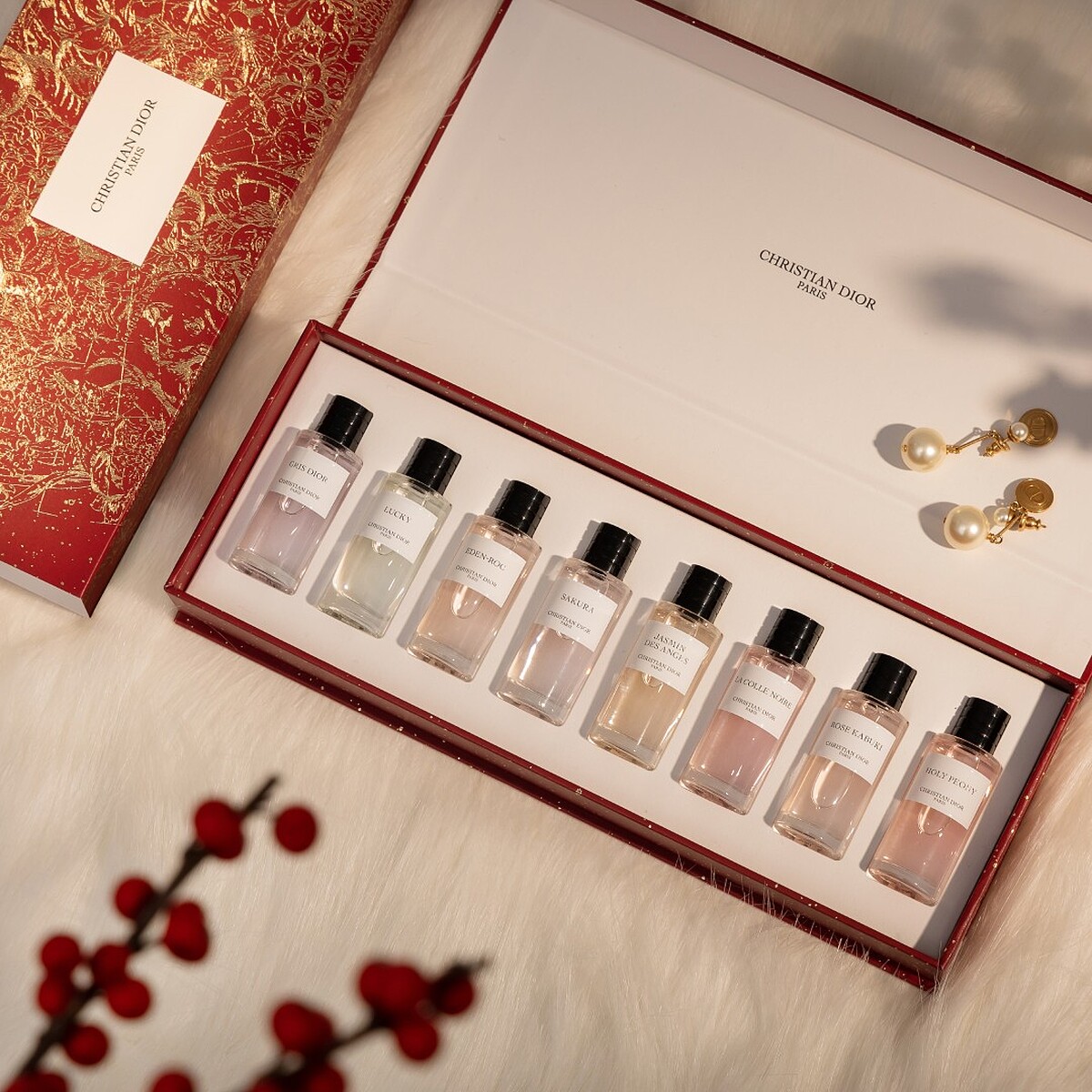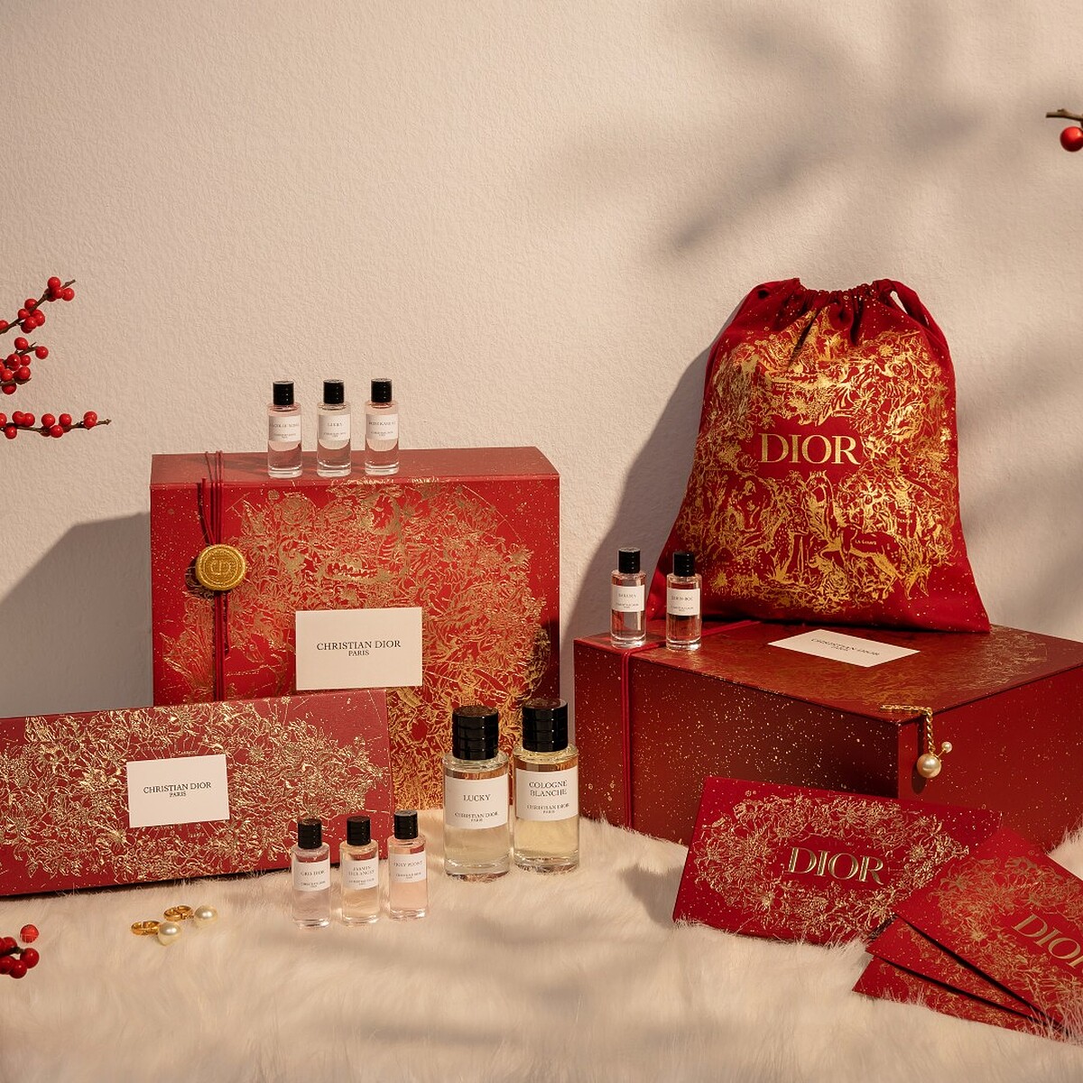 以質感絕佳象徵吉利新年好運的「氣勢如紅」禮盒,綴滿義大利當代藝術家PIETRO RUFFO描繪的幸運星空,繁花點點、星塵熠熠,交錯浪漫星宿與珍奇鳥獸,奢華展現農曆新年獨有的節慶感!將上述星座好運香氛一次收齊, 8 款精巧7.5ml迪奧香氛世家經典香氛:柯勒諾瓦、晚夏茉莉、玫瑰舞伶、蒙田大道、幸運時刻、伊甸岩度假、粉紅櫻花、牡丹香韻。絕對是最佳的香水送禮首選,外盒可重複利用,收納各種心愛小物。