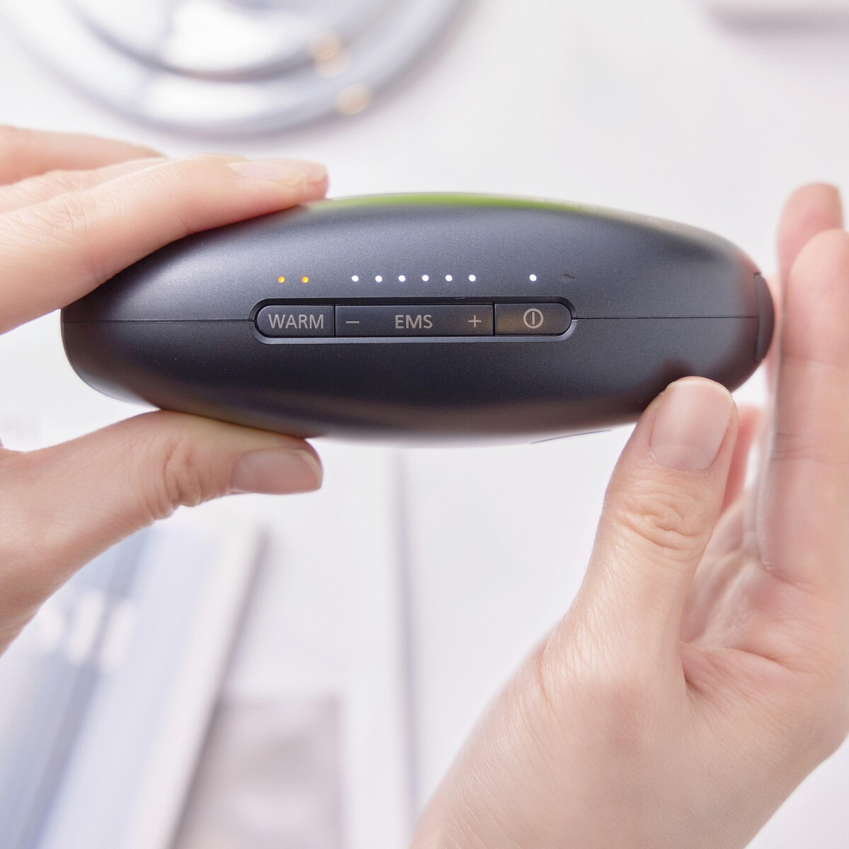 使用方式非常簡單,建議先塗抹上凝膠可讓傳導效果更好,接著選擇檔位的EMS設定(6段檔位),以及2段溫感選擇,再針對在意的部位滑動就能有效鍛鍊。
