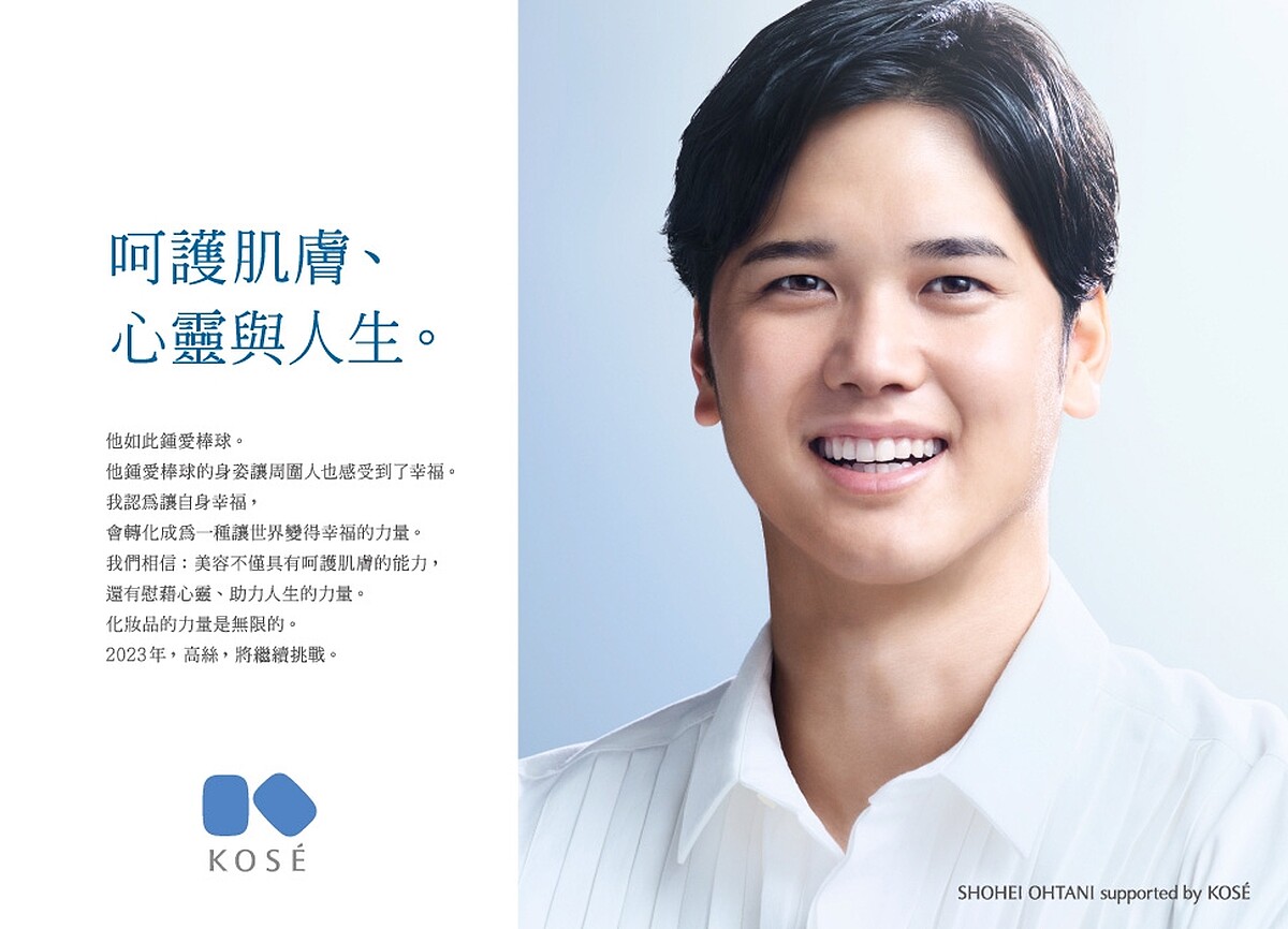 KOSE表示:「從小就在烈日及泥濘中追求棒球夢想的大谷選手,即使面臨嚴厲的訓練及深刻的挫折,也從不放棄夢想、不斷向前邁進,即使已達到今日的成就仍舊持續挑戰;看著他不屈不撓的身影,除了為我們帶來勇氣與感動,也讓人感受到至高的幸福感。為人們帶來夢想與希望的大谷選手與KOSE,期望守護世界上所有人的肌膚、並擁有富足心靈的幸福人生。不論國籍、種族、價值觀、性別或年齡,即使只有多一個人也希望可以貼近他的人生之中,透過化粧品及美容方法,提供肌膚與心靈的潤澤與色彩,期望無論是誰都能展現屬於自己的光彩。」