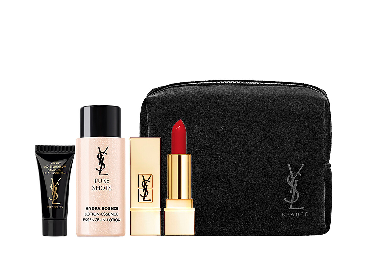 極效活萃澎潤能量露10ml+名模肌密光燦水凝露5ml+奢華緞面唇膏精巧版01+YSL奢華黑絲絨化妝包。