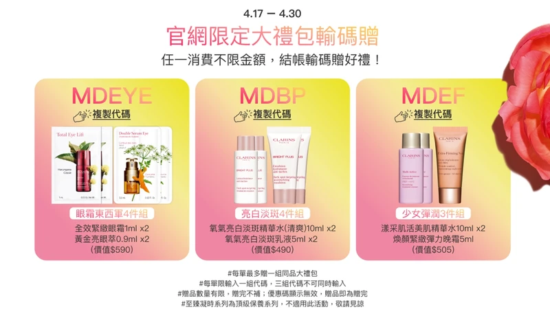 3. 4/17 – 4/30限時加碼!任一消費輸入以下任一優惠碼贈明星品大禮包
