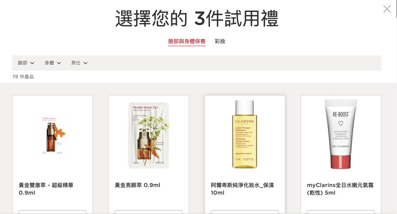 別以為只有這樣,克蘭詩除了植萃專家名號響叮噹,更是傳說中禮物送最多的品牌,母親節優惠期間,只要在官網隨便點一產品加入購物車,馬上跳出新網頁要求妳挑選滿額禮,感動淚哭。