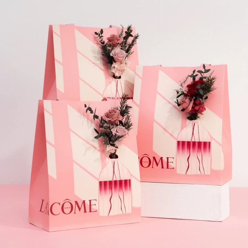 於全台蘭蔻購買任產品滿NT6,000,立即隨機贈送紅玫瑰或粉玫瑰「精緻玫瑰手提禮袋」,袋身上立體吸睛的精緻永生玫瑰巧思,以花語傳遞美麗熱情的愛以及幸福溫馨的愛,不僅能輕巧地將美好心意袋著走,更能裝進不同的蘭蔻彩妝保養品花式獻愛,告白撩心無極限。
