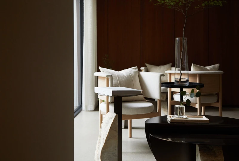 細節如此,連房間都充滿巧思,讓人急欲尋訪。特別以不同的時間代表不同的房間,比如Dawn 晨曦、Noon 晝中、Dusk 薄暮、Midnight 夜半…從開啟房門的瞬間就能感受不同時間軸所帶來的獨特氛圍。房間中所擺設的傢俱同樣維持低飽和大地色系,搭配木材材質,營造出宛如家的溫暖與寧靜。輕盈膚觸且柔軟舒適的 Loro Piana 羊毛毯伴隨愜意舒適氛圍,讓人能全然放心、沈浸其中感受美麗的蛻變。