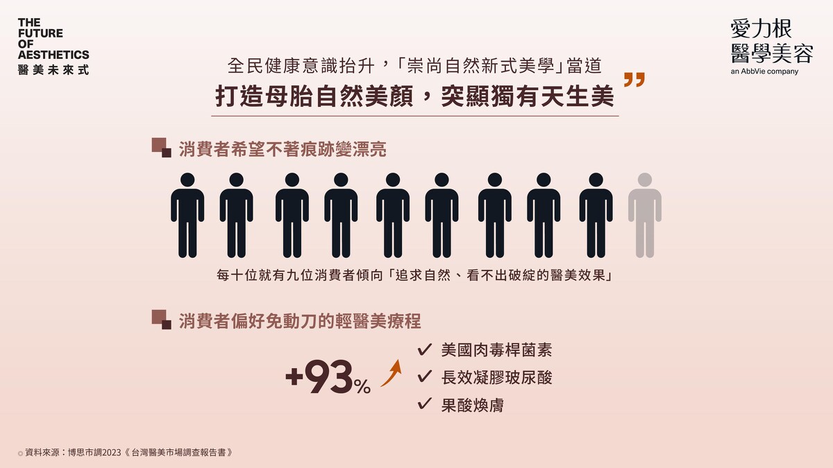 疫後全民健康意識抬升,「回歸自然」風潮席捲全球,而消費者越來越重視身心靈平衡,將個人需求放在首位已是顯學,進而帶動「崇尚自然新式美學」。調查數據指出,十位消費者中就有九位傾向[1]「追求自然、看不出破綻的醫美效果」,讓原生顏值悄悄精緻晉級不著痕跡。追求美和捨得投資自己無疑是愛自己最好的實踐,調查顯示超過93%受訪者表示「偏好選擇非動刀式的輕醫美療程」,恢復期短的低強度微整形[2]療程如美國肉毒桿菌素及長效凝膠玻尿酸相對受到歡迎。透過專業醫師針對個人特質、整體容貌輪廓進行全臉評估,擬定專屬客製化醫美療程,打造母胎自然美顏,突顯獨有天生美。