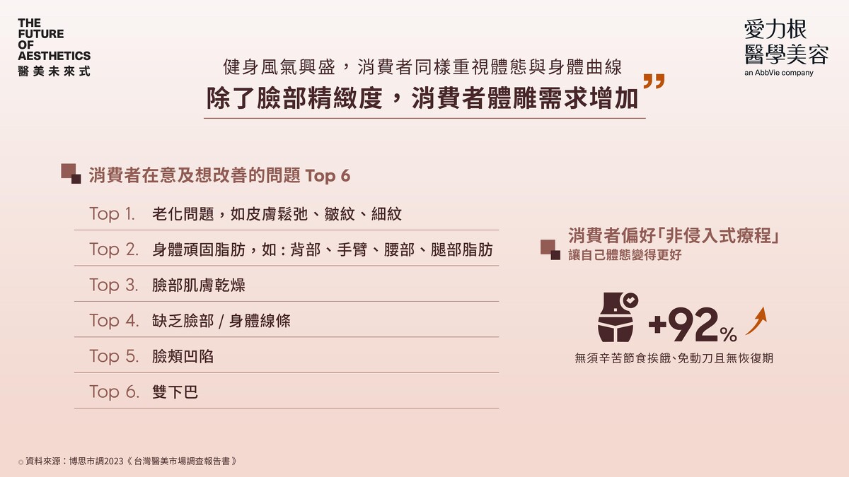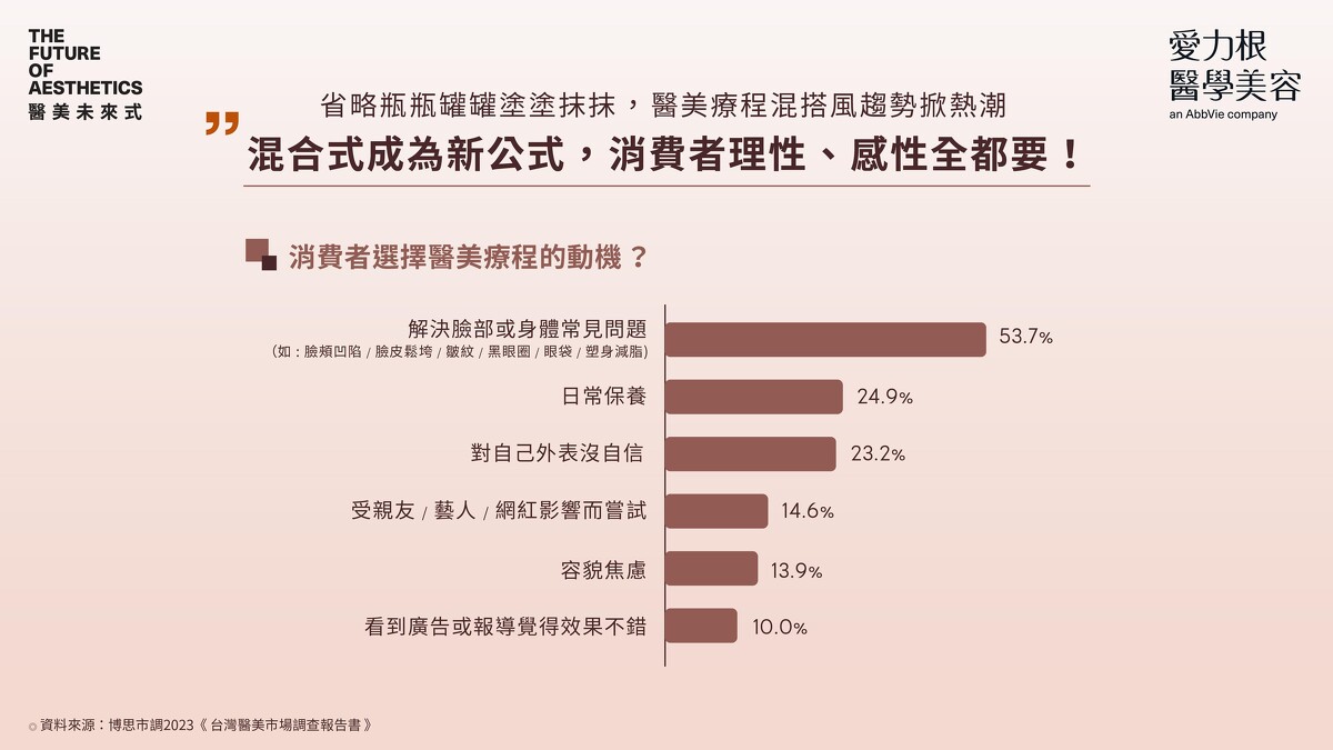 今年2023愛力根醫學美容再度針對台灣醫美市場進行調查分析,其中與2022年相同,消費者對於「臉部與身體曲線」依然高度關注並且重視「全方位醫美體驗」,而審美標準受到數位社群影響更加速多樣性成長。本次最新調查結果更顯示,醫美療程被視為定期保養的一環,「效果自然」為消費者購買醫美療程關鍵因素;醫師以保有個人特色進行「非侵入式療程」、如美國肉毒桿菌素及長效凝膠玻尿酸等低強度局部微整輕醫美為消費者首選。除此,忙碌現代人追求更快速精準的療程效果,「混合式療程」成市場主流,。
