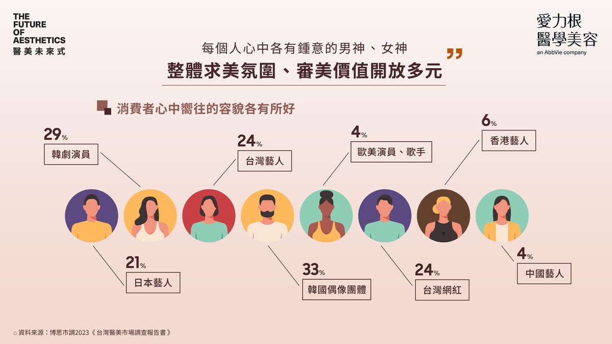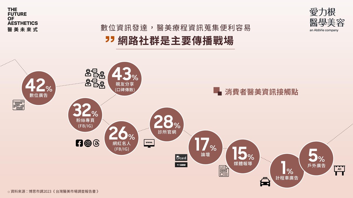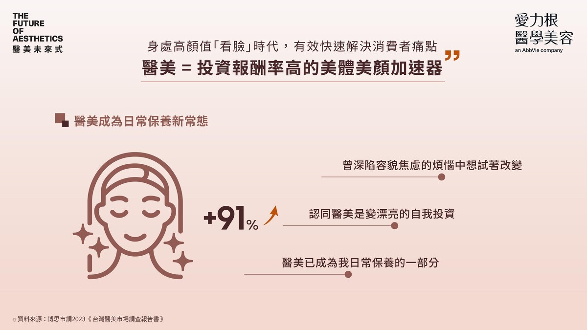 身處資訊發達的數位時代,醫美療程資訊蒐集便利容易,消費者的醫美知識大幅提升,其中網路社群更是主要傳播戰場,根據調查數據顯示,九成以上的消費者表示「容易受到社群影響購買決策」;更有66%的消費者表示自己最常在數位社群上接收到醫美相關資訊。此外,醫美市場近年受娛樂、時尚產業影響,各年齡層心目中的男、女神不同,喜愛的偶像團體或網紅的國籍、外表風格也趨於多樣多變,整體求美氛圍更加開放無框架,過去女性應該柔美、男性應該陽剛的的「二分法」也已不再適用,多元性別族群都有求美的權力,醫美幫助求美者保有自己獨特的特色,展現顏值升級、自信自然的美貌。