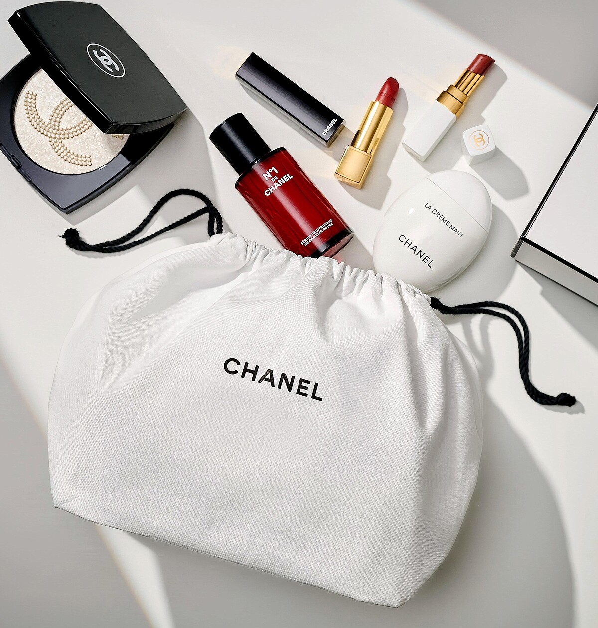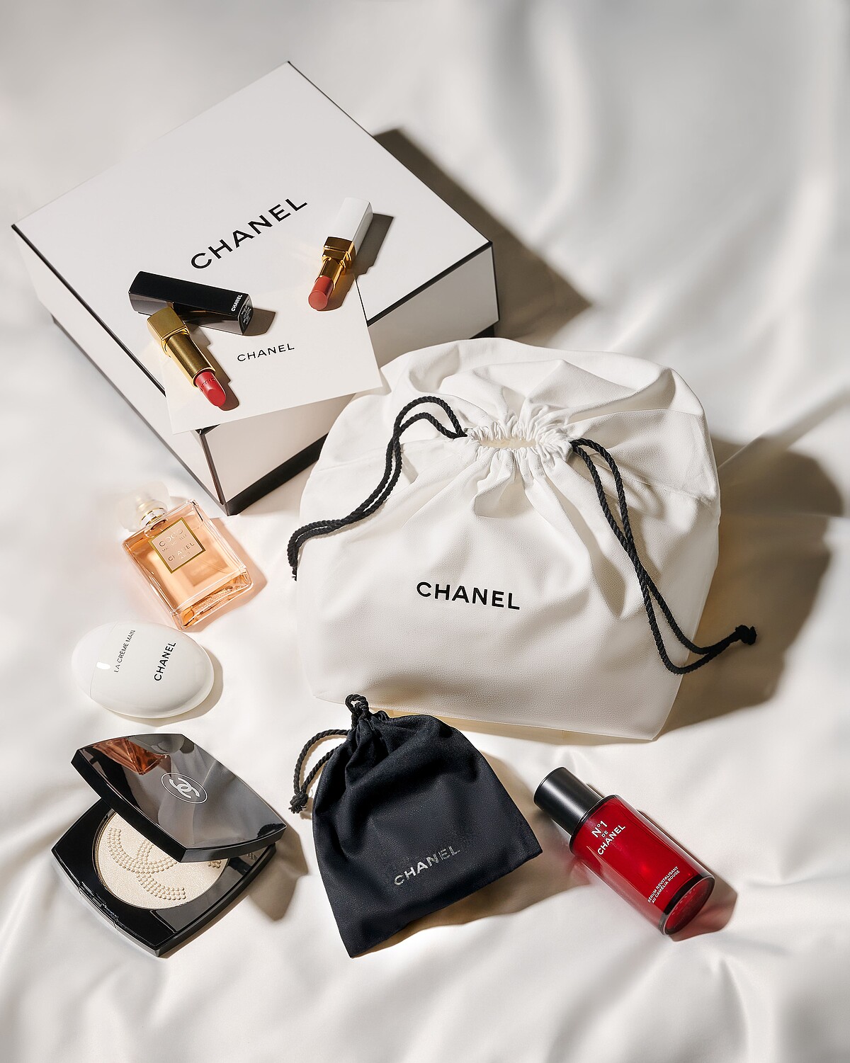 偷偷分享一個祕密:經典包裝中的白色純棉束口收納袋,目前僅隨著經典黑白紙盒一起組合包裝,所以選購的產品綜合體積越大,就有越高的機會一次獲得印有黑色CHANEL字樣的純棉收納袋與紙盒喔~
