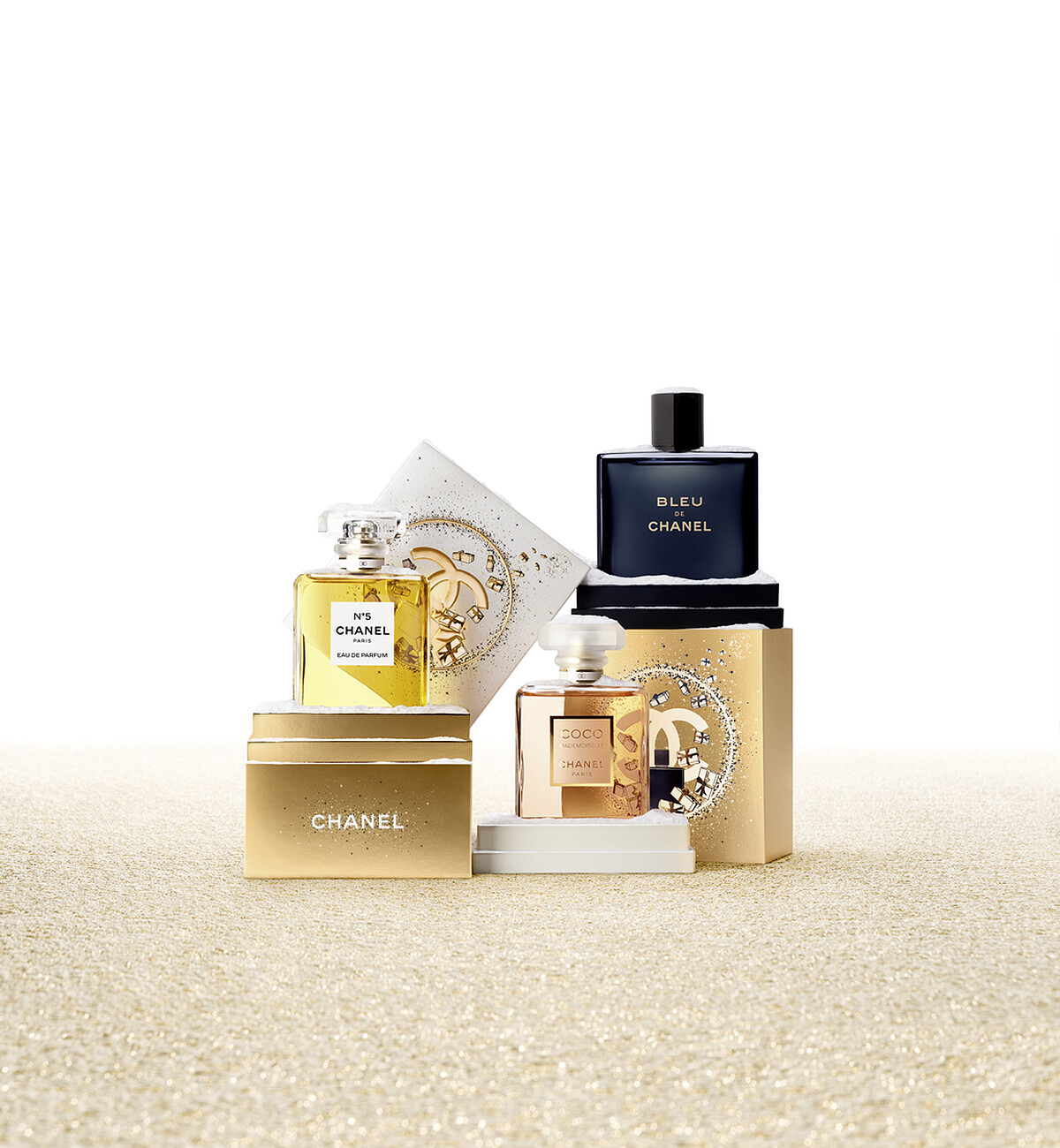 除了夢幻聖誕禮盒外,香奈兒更為經典香氛推出節慶限定包裝,有金色盒身搭配珠光點綴的「香奈兒N°5典藏香水100ml」,以及白色盒身加上金色點綴的「香奈兒摩登COCO香水100ml」,其清新琥珀香調致敬擁有雙重面貌的女孩:自由奔放、可愛討喜、調皮不羈、隨興大方,詮釋現代女性的獨特摩登魅力。另外,由燦金盒身搭配湛藍點綴的「香奈兒藍色男性香精100ml」,象徵著不受拘束、勇於創造自我的特質,完美體現於馥郁且清新的木質調中,呈現令人難以抗拒的多層次香氣…多款香氛符合不同需求的送禮選擇。