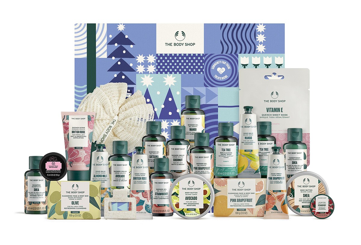 聖誕星光倒數月曆 極光藍,滿載24個臉部與身體系列熱賣商品,包含熱銷第一名的茶樹系列商品以及超過五種不同口味的果香系列沐浴膠,從頭到腳照顧美麗的身體。部分產品的管身及瓶子也是使用透過社區公平交易從印度的街道及海岸線回收的塑膠製成,以藉此支持我們的合作夥伴『Plastics for Change』持續為了防止嚴重的塑膠污染並致力於改善當地工作條件而努力。