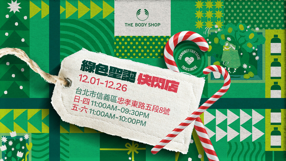 叮叮噹叮叮噹!THE BODY SHOP美體小舖將於12/1至12/26在台北市政府1F連通道設置為期三週的綠色聖誕快閃活動,以巨型聖誕禮物為題,傳遞THE BODY SHOP支持社區公平交易、提供更多均等的工作機會以及支持女性的理念,現場設有網美拍照打卡點,於活動期間成為會員並在IG上發布打卡照、tag指定Hashtag,即可免費獲得果香滋養霜50ml,於12/9~10、12/16~17、12/23~24(6天)於現場不限金額消費即可獲得『聖誕限定小樹苔球』一份。