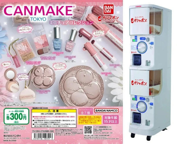 台灣的大家也很熟悉的日系開架品牌就是CANMAKE!至今一直都是很受歡迎的品牌,像是臥蠶專用的淚袋盤、臥蠶遮瑕筆等,今年2月底在日本推出超擬真扭蛋,品項包含花瓣腮紅、棉花糖蜜粉餅、指彩和潤澤唇膏,唇膏還能真正把蓋子打開,雖然不能真的使用,但正品和超擬真迷你模型擺在一起真的好可愛!