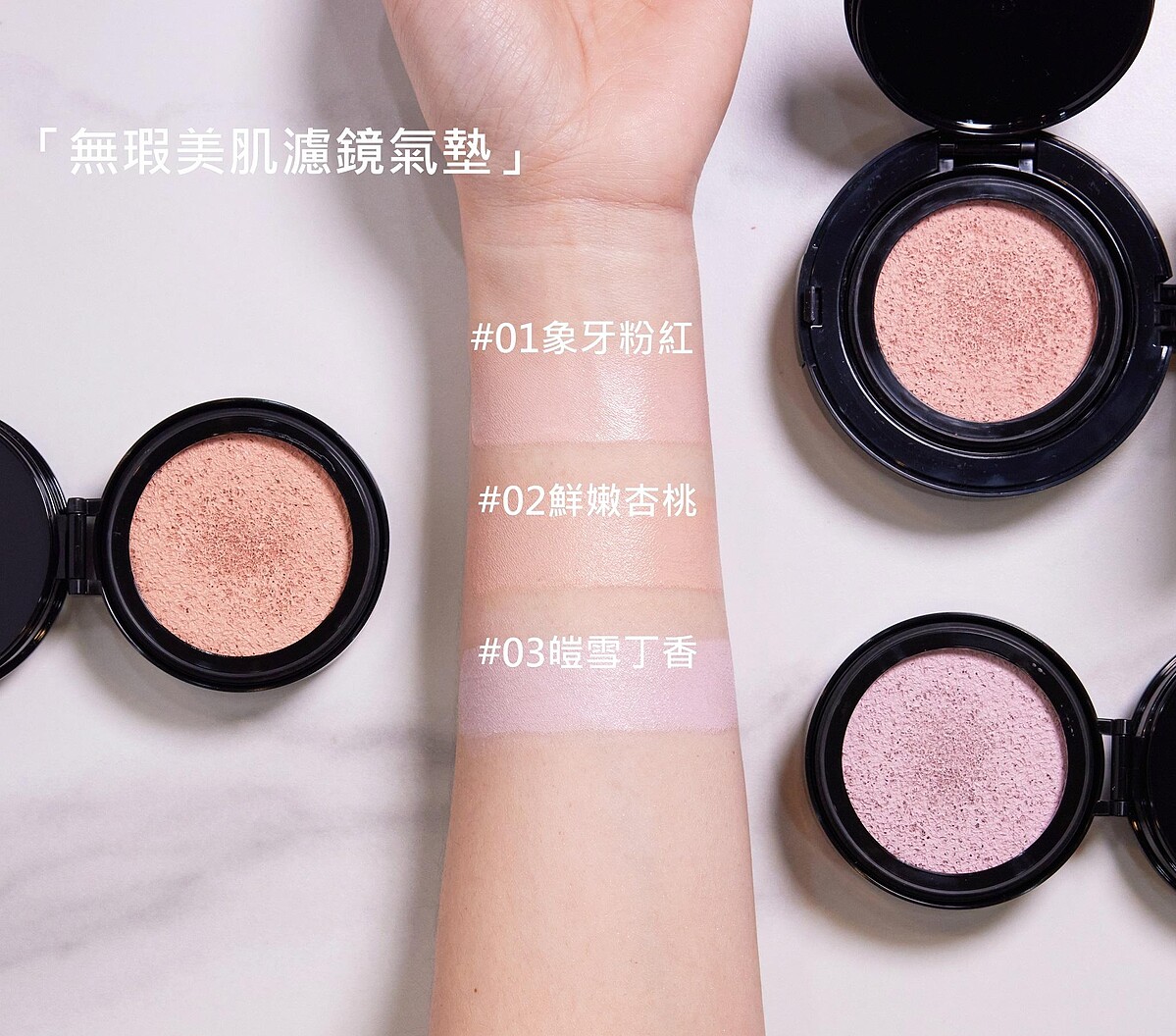 無瑕美肌濾鏡氣墊貼心推出三個色號:#01象牙粉紅、#02鮮嫩杏桃、#03皚雪丁香,可以根據妝容需求做挑選。M編選用#01象牙粉紅,拍出粉嫩透亮的白桃肌~如果想要均匀膚色,可以挑選#02鮮嫩杏桃,增添活力元氣感;有肌膚泛黃困擾的話可以用#03皚雪丁香,輕鬆打造冷白肌。上妝時可以少量多次疊加,打造喜歡的妝容效果。