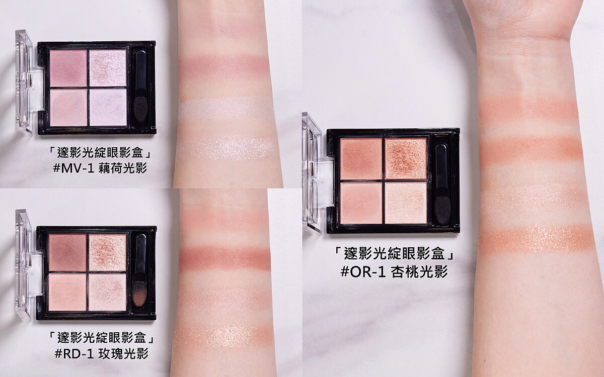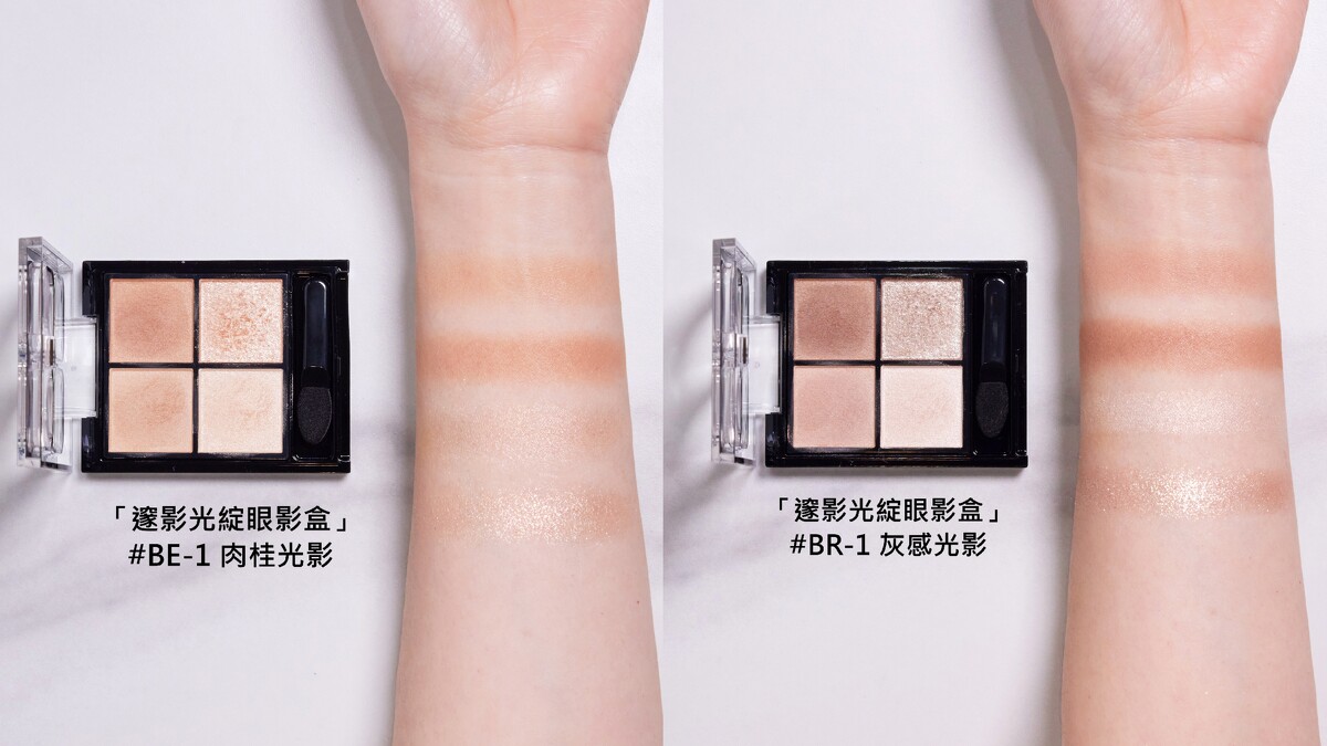 以柔霧&璀璨2種不同質地組合的4色眼影,推出共5款色調:#BE-1 肉桂光影、#BR-1 灰感光影、#OR-1 杏桃光影、#RD-1 玫瑰光影、#MV-1 藕荷光影。每款都實用百搭、只要2步驟畫出立體圓潤大眼,打造乾淨的淡顏系雙眸。