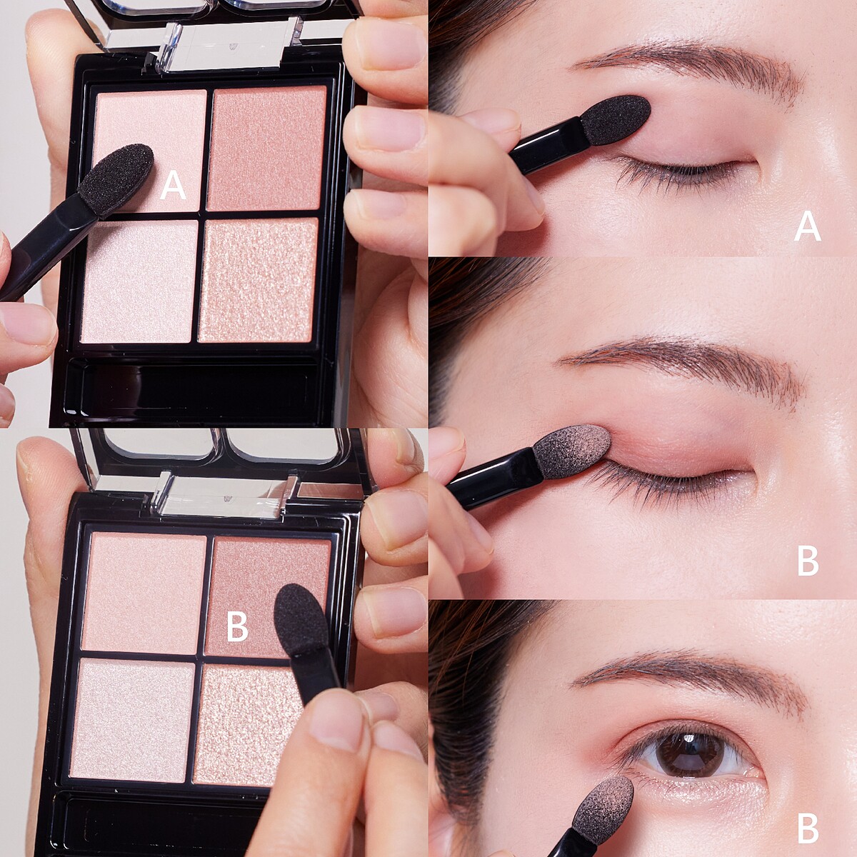 STEP1:先使用質感柔滑的霧面2色,以眼影棒沾取A、B分別抹於上下眼皮整體,加乘深邃、放大雙眸的效果。
