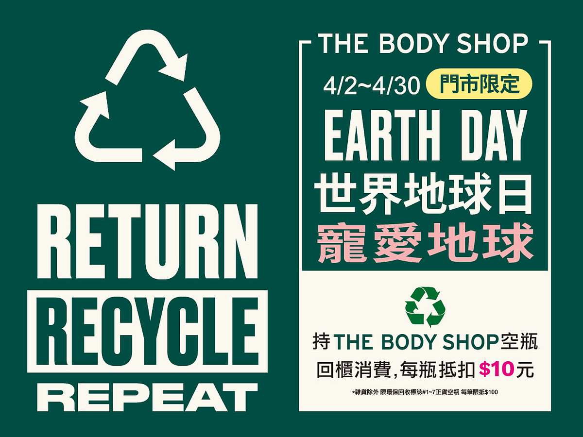 不管是送親愛的媽咪,還是自己囤貨都超級適合的THE BODY SHOP,母親節推出超多優惠組,盡情挑選價格超甜,不怕荷包失血,加上今年THE BODY SHOP迎來在台36週年,特別獻給粉絲們大寫的愛,購買指定商品享3件82折、5件75折、6件以上63折,指定生日精選禮盒68折,同時世界地球日期間4/2-4/30,門市限定持THE BODY SHOP正貨空瓶至門市回收,每個空瓶折抵10元,最高折抵 100 元,怎麼算都覺得不買對不起自己!(限抵扣正價商品(雜貨、皂類、small size 除外);瓶子有環保回收標誌 1-7 的才可以兌換;空瓶回收不得與其他優惠/抵用券併用)