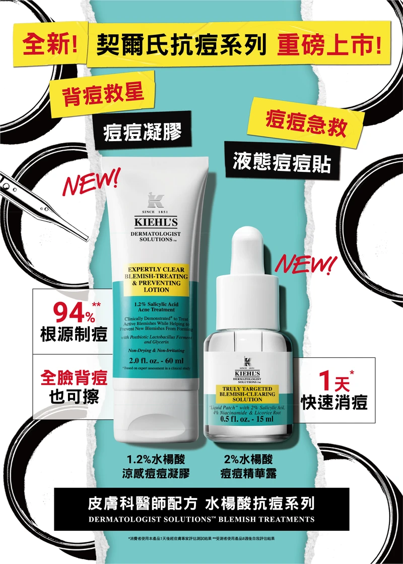 天氣漸漸悶熱臉上粗大毛孔大爆油狂冒痘痘、粉刺叢生真的很NG!Kiehl’s契爾氏聽到你們的心聲推出超給力的水楊酸抗痘系列,超強新品「1.2%水楊酸涼感痘痘凝膠」、一上市就賣爆的「液態痘痘瑕疵貼」,聯手幫助肌膚高速消痘再幫你養出不易長痘的穩定肌膚!