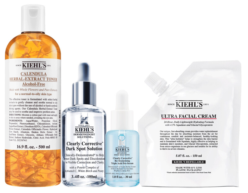 內容:金盞花植物精華化妝水500ml+激光極淨白淡斑精華100ml+冰河醣蛋白保濕霜補充包150ml+ 激光三酸煥膚精華液30ml。