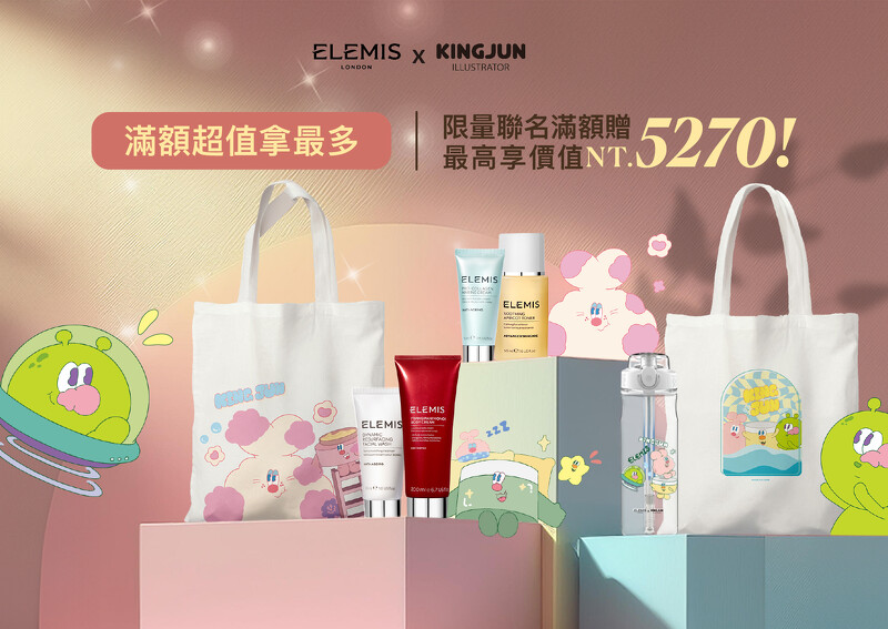 3.消費滿NT8,000 即贈 ELEMIS x KINGJUN 聯名水瓶、ELEMIS x KINGJUN聯名托特袋、海洋膠原緊緻精華乳霜 15 ML、煥膚亮顏洗面乳30 ML、杏桃紓緩化妝水50ML(總價值NT3,870)