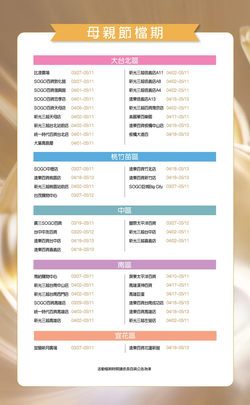 *「小瓶價、霸容量」、「鏟出幸福」活動指定專櫃:SOGO百貨台北店、新光三越信義A8/A11、新光三越南西店、板橋大遠百、中壢SOGO、巨城SOGO、新光三越台南西門店、新光三越台中店、台中中友百貨、台中遠東百貨、高雄巨蛋、統一時代百貨高雄店
