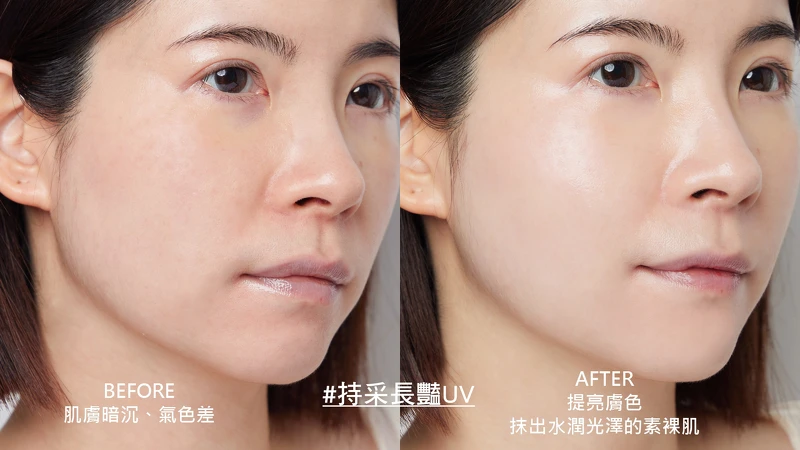 #持采長豔UV:特別適合只想素顏出門,又想兼顧防曬與好氣色;或需要妝前打底來維持全天精緻妝容~自然提亮效果、加上微微光澤,讓膚色更加明亮透潤,單擦作為基本防曬+提亮膚色,也能當成妝前乳使用,讓妝感更加細緻完美!