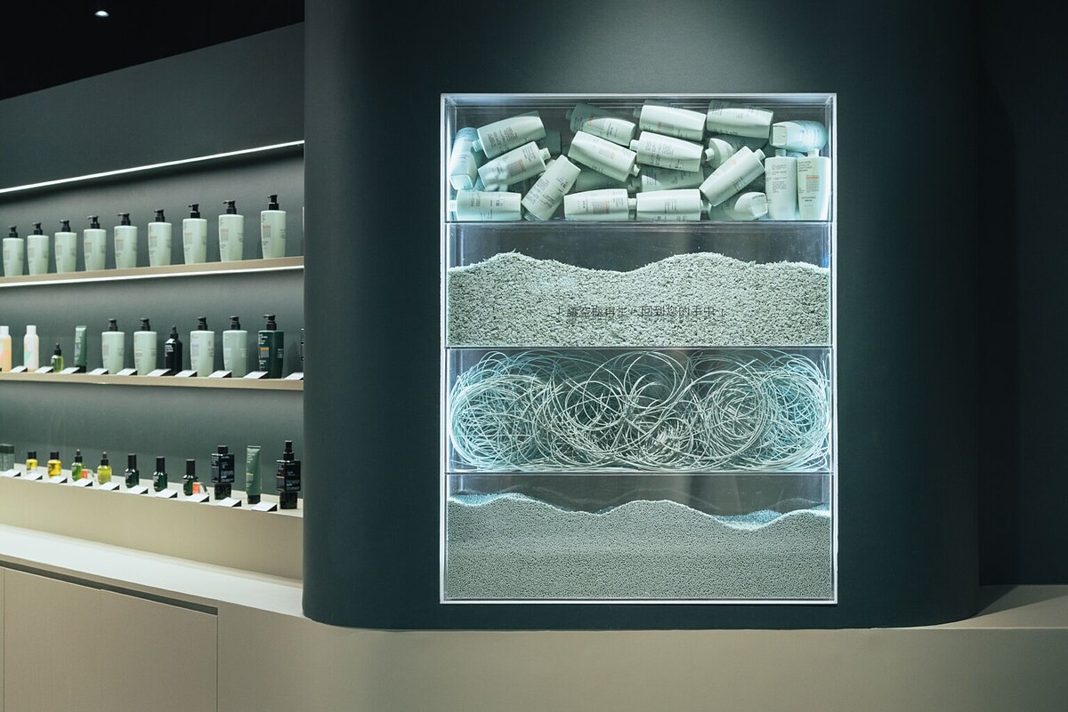 此外,綠藤自2017年開始實施塑膠空瓶回收計畫,店内也設置了精緻的透明燈箱,展示了空瓶「封閉循環」的過程:從破碎、抽絲、造粒到最後重塑再生瓶器,詮釋了品牌對於環境保護的堅持。