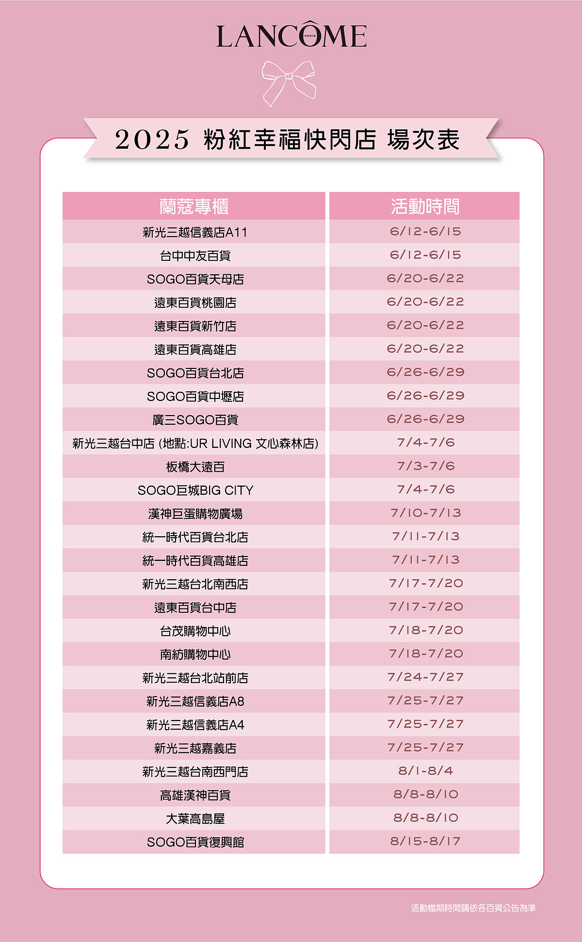 *蘭蔻粉紅幸福快閃店 粉紅拍貼機限定場次:SOGO百貨台北店、新光三越信義店A4/A8/A11、新光三越台北站前店、新光三越台北南西店、板橋大遠百、遠東百貨桃園店、SOGO百貨中壢店、遠東百貨新竹店、台中中友百貨、新光三越台中店(地點:UR LIVING文心森林店) 、遠東百貨台中店、新光三越台南西門店、漢神巨蛋購物廣場、統一時代百貨高雄店