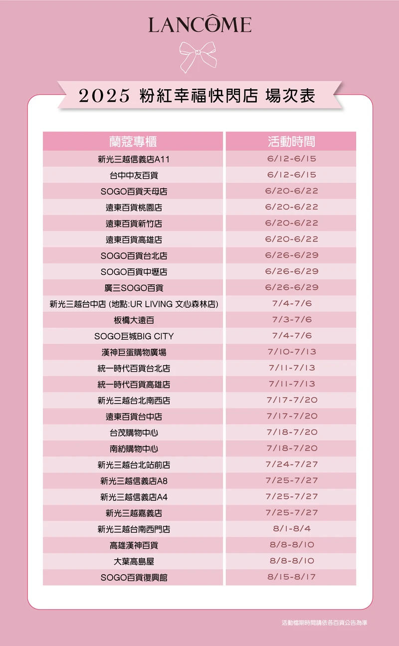 蘭蔻粉紅幸福快閃店 全台巡迴場次表