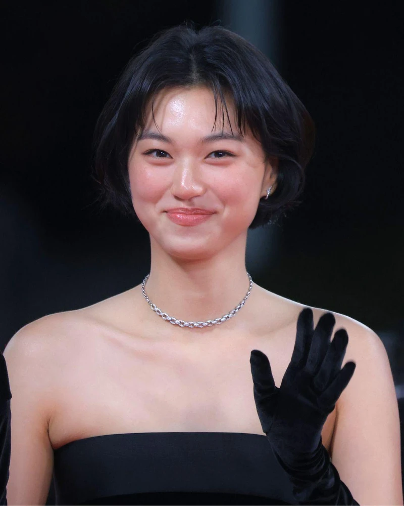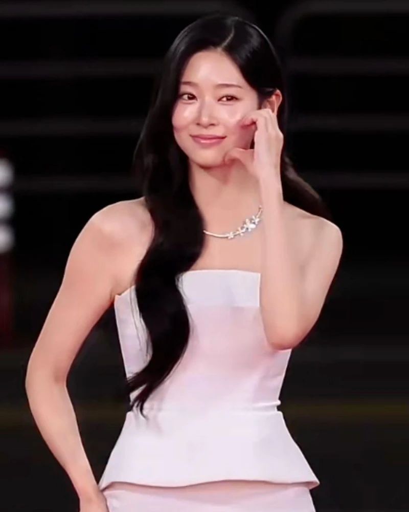 金所炫這次穿上黑色花瓣肩帶禮服,搭配她最擅長的春日甜心系!底妝以輕霧柔亮的質地打底,臉上帶著若有似無的紅潤腮紅,舊像是天生的氣色好。眼妝以棕橘色輕柔暈開,眼下再加一點細緻光澤,讓神情看起來更柔和亮眼。唇色則是蜜桃粉,甜度剛剛好、不會過分可愛。搭配禮服肩帶的花瓣線條,整體散發一種「春日戀愛感」的清新氣質,甜美中又帶著優雅,是當晚非常明亮的存在。