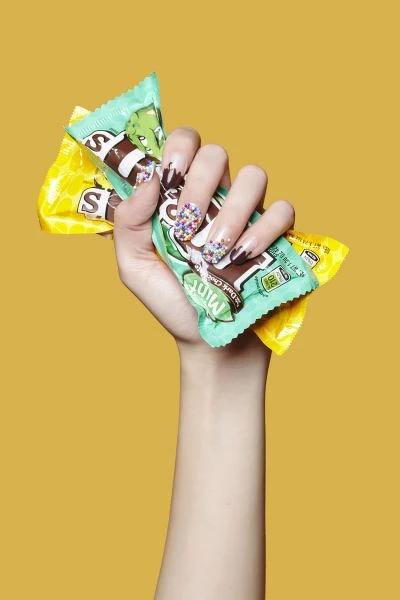 裹著糖衣的巧克力球不小心撒落指尖,錯落在捨不得一口吃掉而融化的雪糕之間,顏色鮮跳讓心情也繽紛,童年回憶就這麼從指尖流曳…