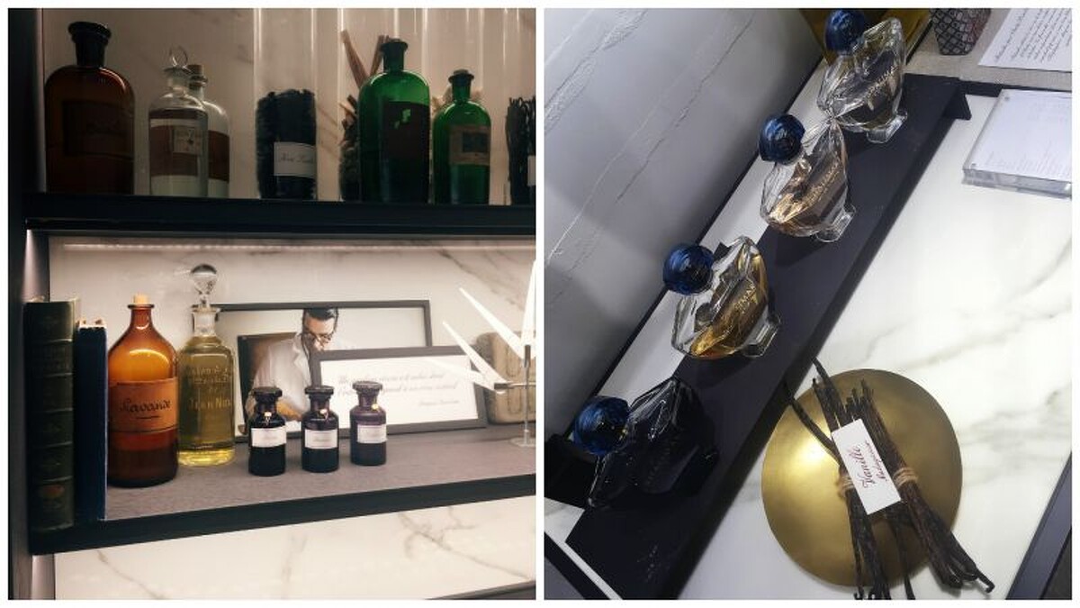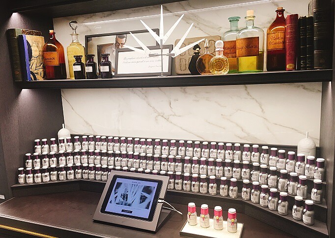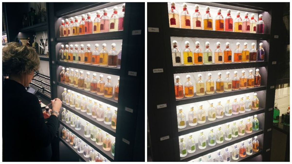 首先,不要急著踏進店裡,在門口徘徊時,你一定會對櫥窗內的風景吸引,原因是這間香氛概念店被刻意區隔出兩間迥然不同的房間,左邊是展示與諮詢區,收藏著100多款的嬌蘭香水,根據調香師最愛的14種原料分類;右邊則是少見的調香訂製區,可以看到客人正在為挑選緞帶或包裝而猶豫不已。