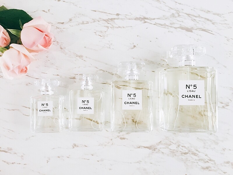 ↑左起為N°5 L’EAU 清新晨露淡香水35ml、50ml、100ml、200ml。