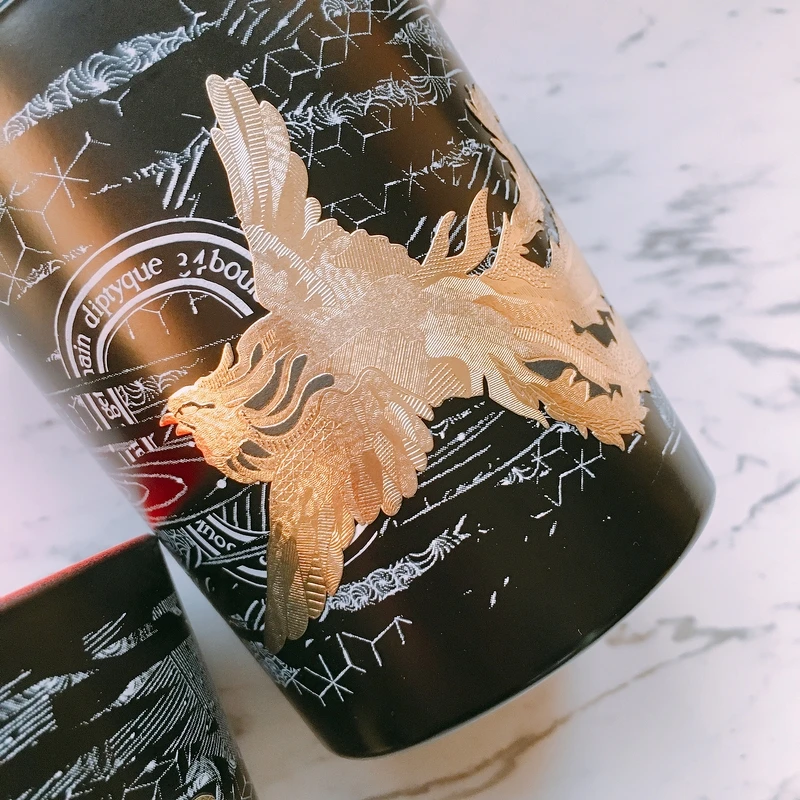 今年diptyque的聖誕蠟燭很不一樣,蠟燭本體從過往的白色變成紅色、綠色、藍色等鮮明色彩,不只吸睛,同時也與蠟燭瓶身上的神獸圖案有所呼應。