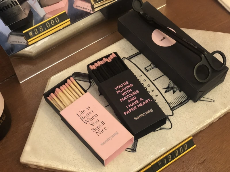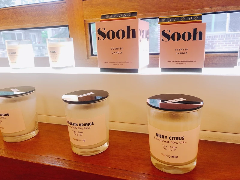 最有名的Soohyang香氛蠟燭多達30多種香氣,還有著首爾形象的名字,如:江南8、梨泰院565、東大門、南大門、梨花等都入列,以及漢南紫丁香俱樂部、接吻練習、穿過橄欖樹叢等有趣的名稱。