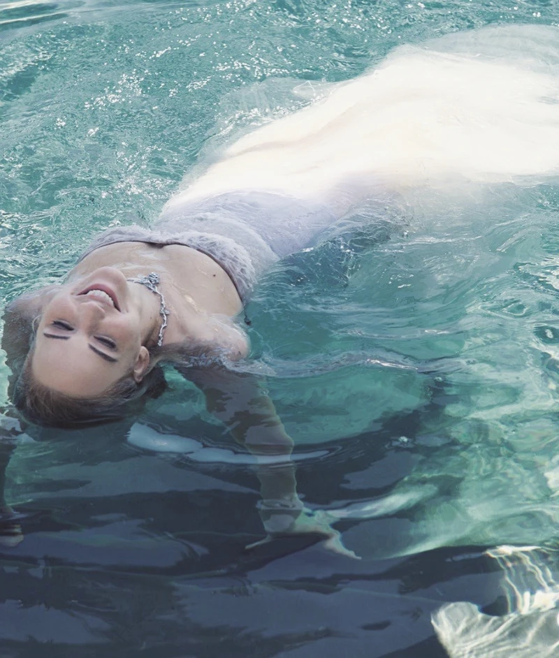 廣告影片中珍妮佛勞倫斯穿著迪奧高級訂製的白色網紗洋裝,如翱翔的飛鳥一縱而下跳進水池,她自在愉快的像魚兒悠游池中,與男主角水中擁吻,在夜晚仰躺在波光粼粼的水面,眼中泛著無數星光,是世界上最快樂的女人。