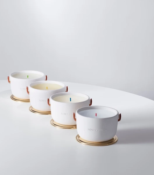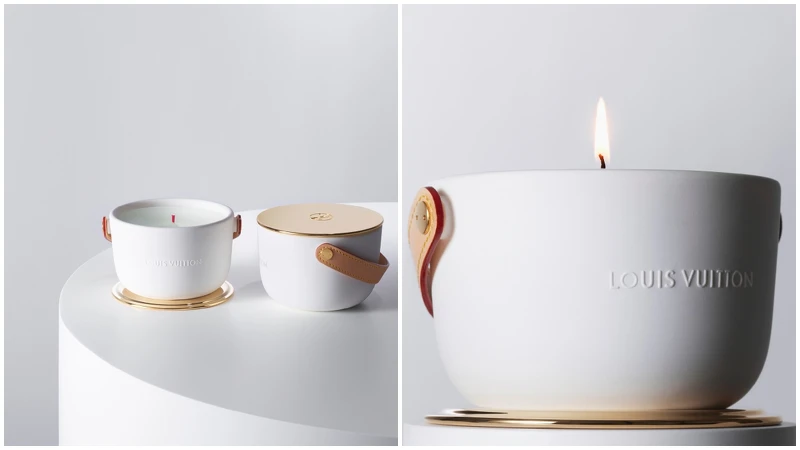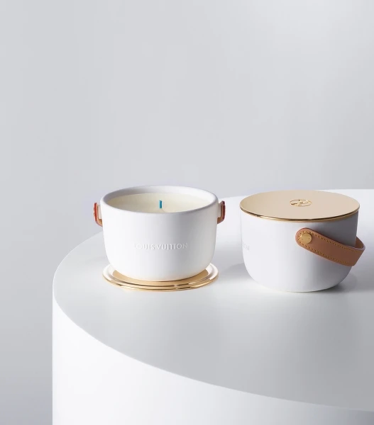 2018年推出LV香氛蠟燭,第一眼看到就會被簡約外型吸引,容器特別採用手工製作的陶瓷鑄造而成,並採用象徵品牌的天然皮革材質來製作提把,同時以金屬鉚釘固定在白瓷,目的在於方便攜帶。要點燃蠟燭時,取下金屬上蓋,放在蠟燭下方即可作為底座。