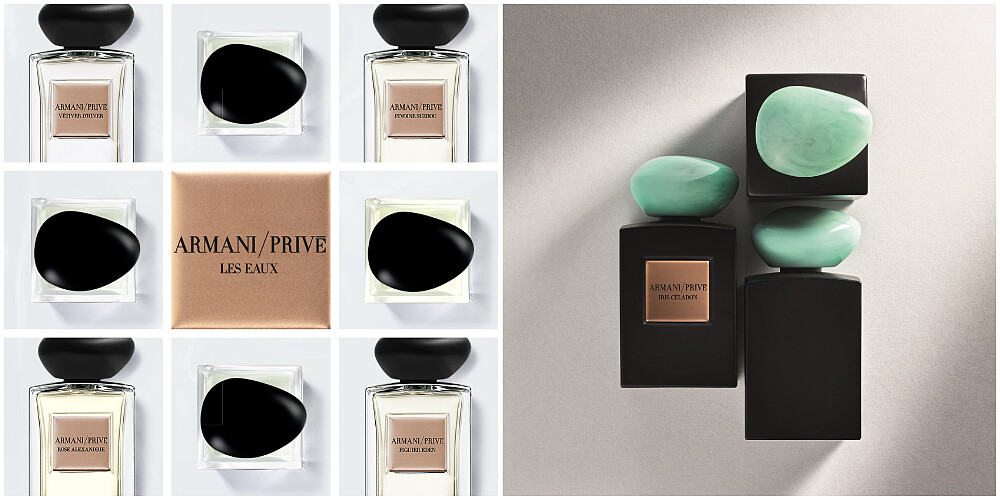Armani/ Privé香水瓶全數採用玻璃或原木製作的手工瓶身,以黑、白色為主,線條簡單,再搭配宛如玉石、琥珀般溫潤色澤的標誌性瓶帽。其中La Collection收藏系列中,七款香氛分別模擬七種珍稀玉石,並以各自的玉石特色結合香氛來命名,如:鳶尾青瓷,即採用高貴的鳶尾花為主調,結合藍綠色調的青瓷瓶帽,整體展現出東方藝術之美。
