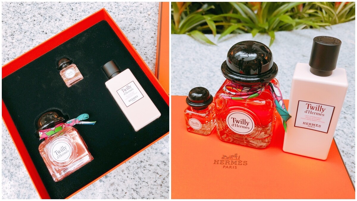 Twilly d’Hermès淡香精在2018年也推出聖誕禮盒「絲意淡香精限量禮盒」 ,裡面一樣有著Twilly d’Hermès淡香精85ml ,裡面還會附上Twilly d’Hermès淡香精7.5ml 以及保濕潤膚乳80ml。