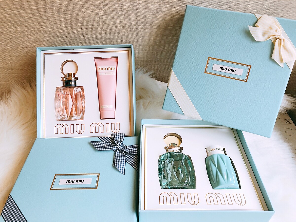 春日花園淡香精及粉色嬉遊淡香水分別推出香氛禮盒。「春日花園格紋緞帶香氛禮盒」裏頭內含春日花園淡香精100ml+身體乳100ml,經典的水藍色禮盒繫上與瓶蓋相同的鵝黃色格紋緞帶,復古中又帶點俏皮情懷。「粉色嬉遊格紋緞帶香氛禮盒」則內含粉色嬉遊淡香水100ml+花園精粹淡香精香氛護手霜75ml,miu miu經典的水藍色禮盒繫上海軍藍的復古格紋緞帶,絕對是送禮首選。