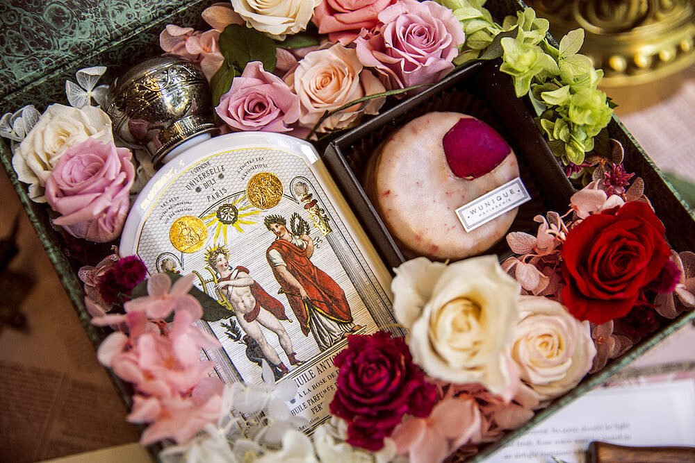 Officine Universelle Buly和法式甜點店「WUnique Pâtisserie吳一無二法式甜點」合作,推出 2019 情人節限定禮盒,綠色復古圖紋的禮盒中,承裝著覆盆莓蛋糕和永生玫瑰等乾燥花材,一打開就能聞到馥郁的大馬士革玫瑰花香。