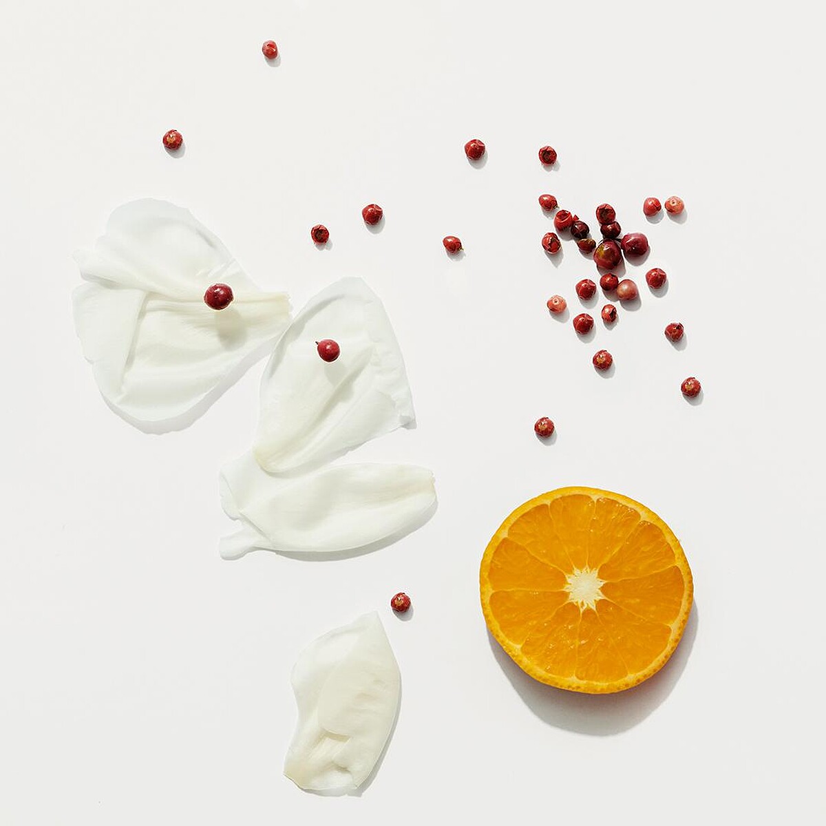 外瓶透明如粉紅冰晶麝香般的設計,瓶身以粉紅霧面毛玻璃呈現,底部造型以俐落大方的圓弧曲線設計搭配單朵盛開的小雛菊瓶蓋,整體猶如單朵花束般輕巧迷人。