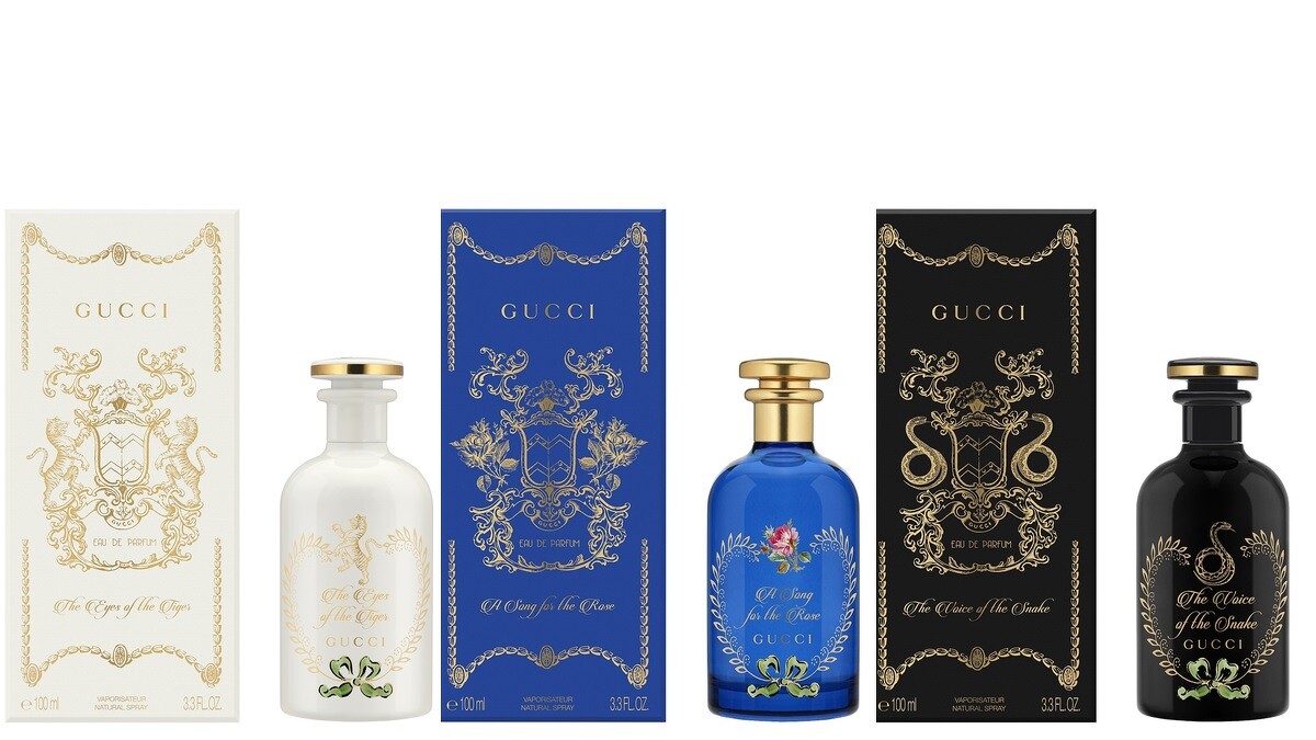 此系列最令人驚嘆的精緻包裝,瓶身源自藥商的古老木櫥中發現的瓶子,7款淡香精盛裝在復古漆瓶中,瓶身以金色環圍繞,佐以動物圖騰作為裝飾,全部皆是白色漆瓶。只有「蛇足之聲:沉木」是黑色,「玫瑰之歌」則是Alessandro Michele親自挑選的藍色。Alessandro Michele表示,此款裝滿玫瑰精萃的藍色瓶子令他想起在母親浴室中看到的藍色瓶子。