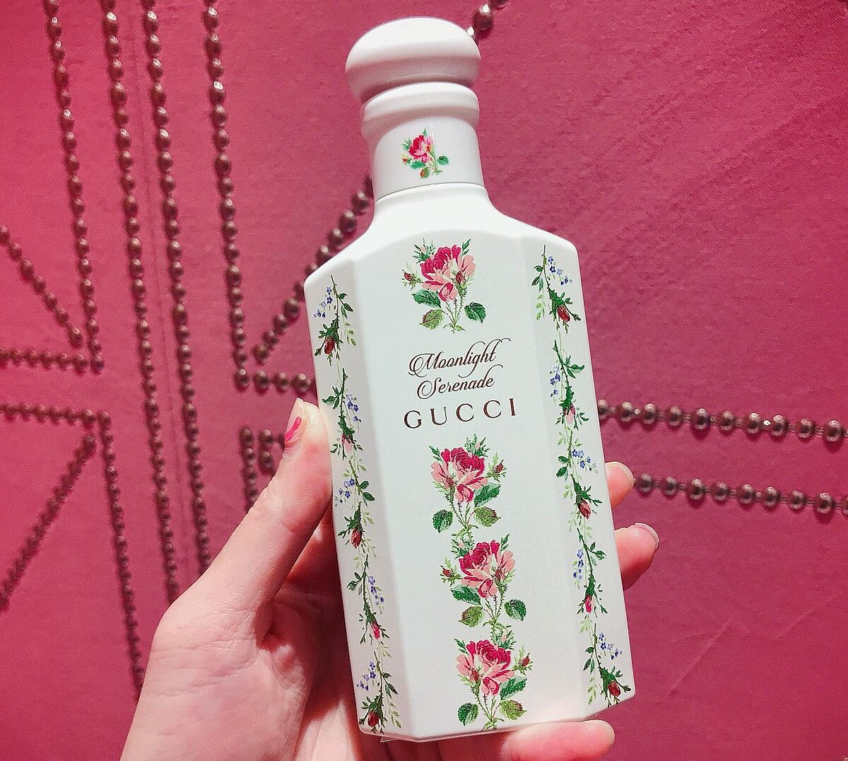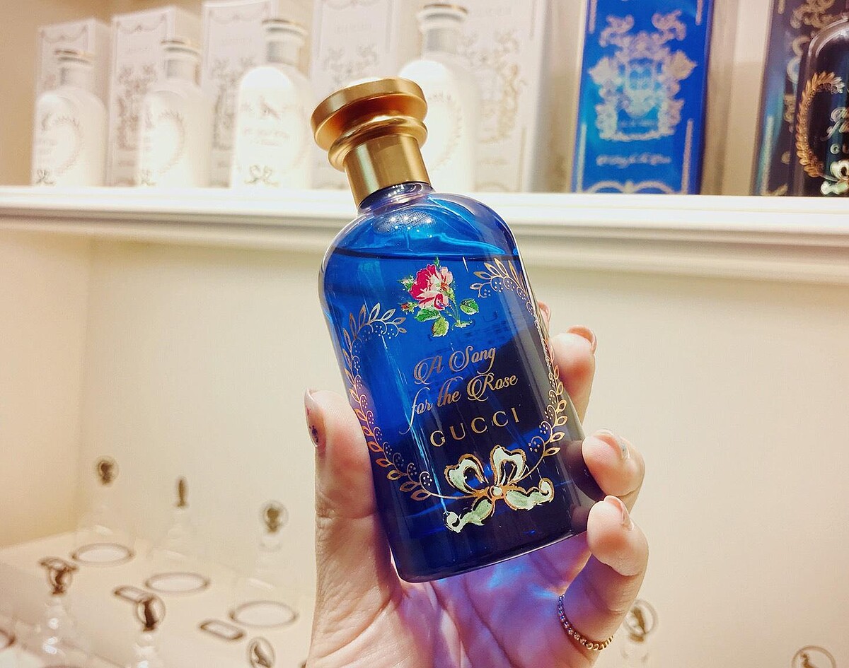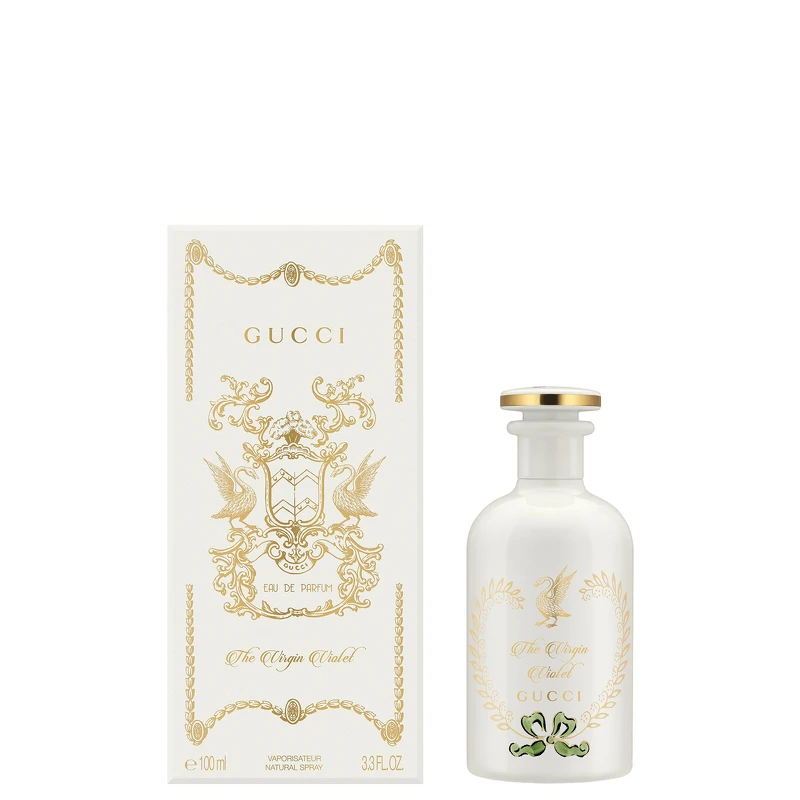 3款香氛純露被盛裝在特別打造的白瓷瓶中,上頭印製著Gucci極為女性及個性化的粉紅玫瑰印花。4款香氛精油盛裝於鼠尾草綠的漆瓶中,並以精緻玻璃滴管的方式為特色。香氛蠟燭則是以「紫羅蘭初夜:紫羅蘭」香氣為主,瓶身為華麗的白色瓷罐,搭配金製邊框設計。