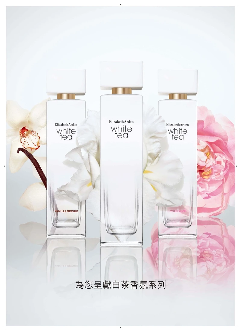 茶香香水專家 伊麗莎白雅頓以品茶時的美好記憶為靈感,於2017年推出白茶香水,捕捉第一口輕啜茶香的無憂寧靜,重現當時的愉悅與幸福;2019年,Elizabeth Arden伊麗莎白雅頓以白茶香水的純淨靈魂為基礎,推出兩款全新之作-白茶花綻野玫瑰香水與白茶溫煦香草蘭香水,詮釋出屬於愉悅與幸福感的不同面貌。