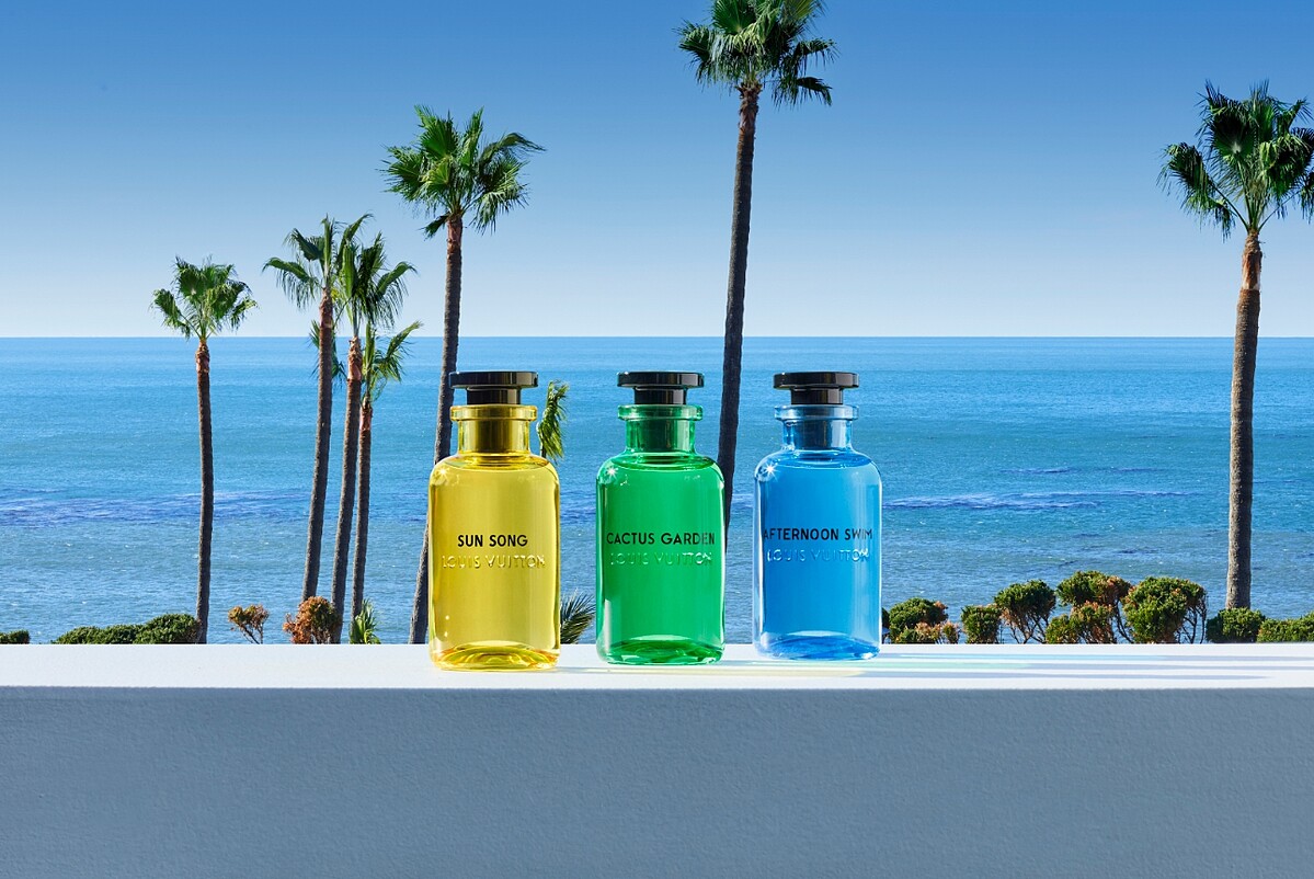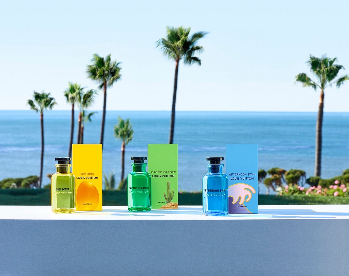 路易威登在推出新香氛 Sun Song、Cactus Garden、Afternoon Swim 三款香水之際,邀請了藝術家 Alex Israel 設計香氛包裝。身兼多媒體藝術家、影片製作者的 Alex Israel,年初才跟 Rimowa 合作,作品也能見於 Gagosian 等知名藝廊。設計靈感受到故鄉洛杉磯的影響,棕欖樹、藍天、大海總是躍上他的作品,在與 Rimowa、Louis Vuitton 合作過程中,能看見作品帶有奇幻而明亮的大自然色彩。然而,Alex 喜愛描繪的天空景色,更有獨特的美感,有時是清澈的藍色,有時是魔幻時刻的萬紫千紅。
