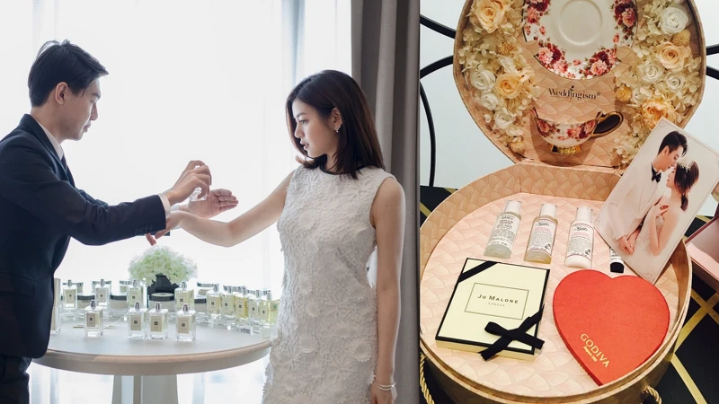 像是藝人陳妍希和陳曉2016年結婚時,就選擇用牡丹與胭紅麂絨、鼠尾草與海鹽小香水當作伴手禮。陳妍希穿婚紗時也噴上英國梨與小蒼蘭揉合浪漫紅玫瑰,營造純淨典雅香氛。