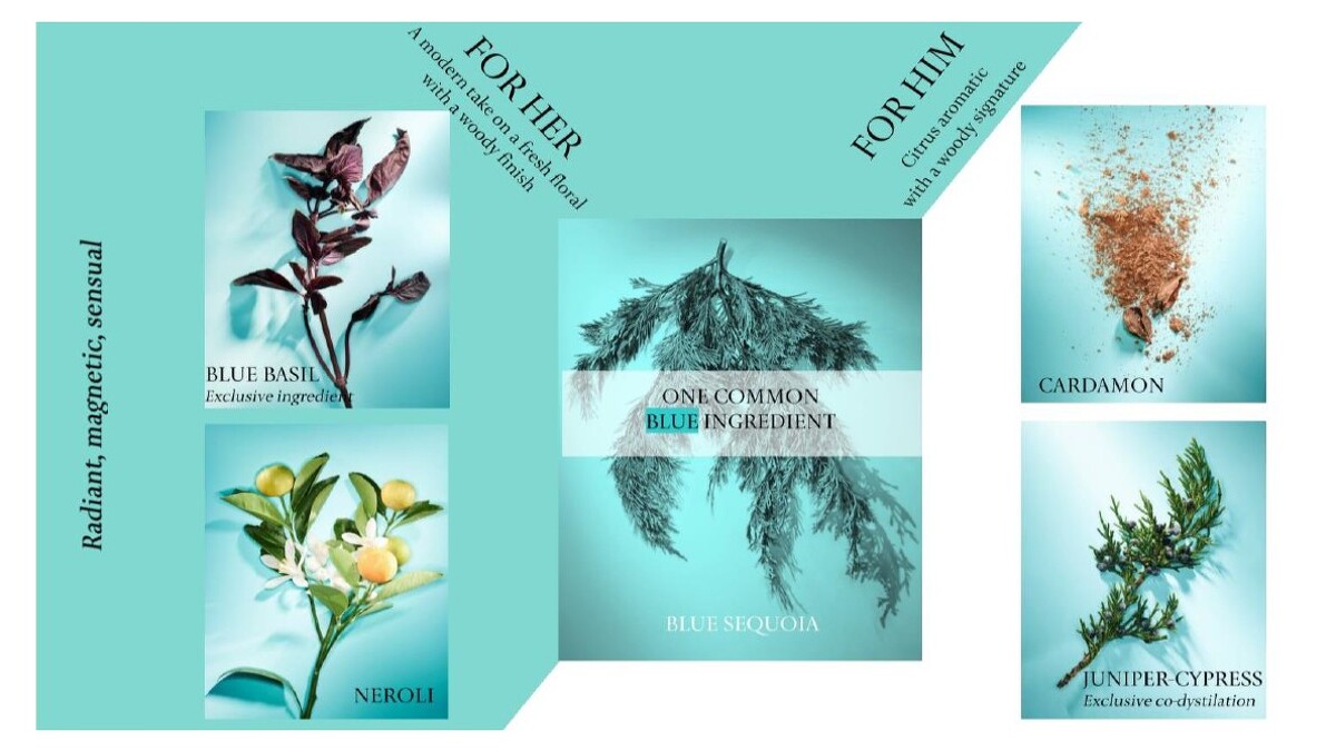 由著名調香師Honorine Blanc 和 Marie Salamagne of Firmenich帶領我們展開一段鼓舞人心的香氛旅程。香調以明亮及清新元素揭開序曲,專為Tiffany研發的藍色羅勒配上葡萄柚,帶來芳香的清新,橙花精萃為主調混合藍木紅衫,並加入香根草、雪松形成細膩香氣,為女人的肌膚提供了最奢華的香氛首選。