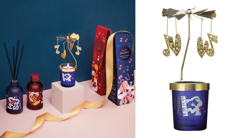 innisfree 2019年以「音樂」為主題,與荷蘭平面設計師Jordy Van Den Nieuwendijk攜手打造2019綠色聖誕系列。當中的「歡樂頌香氛蠟燭」屬於木質麝香調,非常適合秋冬。而且今年更首度附上金色旋轉燭罩,利用燭火的熱對流原理讓音符圖案的扇葉旋轉,打造溫暖歡樂的聖誕氣氛!